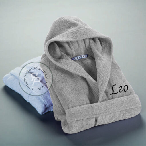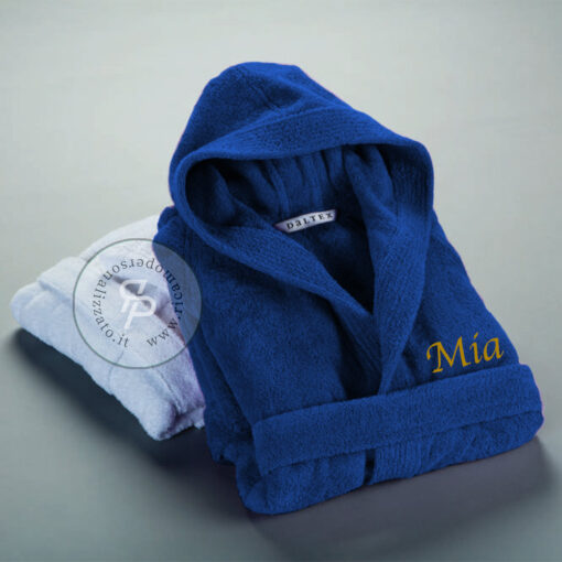 Accappatoio personalizzato con nome in spugna di cotone 100% anallergico, ideale per accogliere chi lo indossa in un grande e confortevole abbraccio.