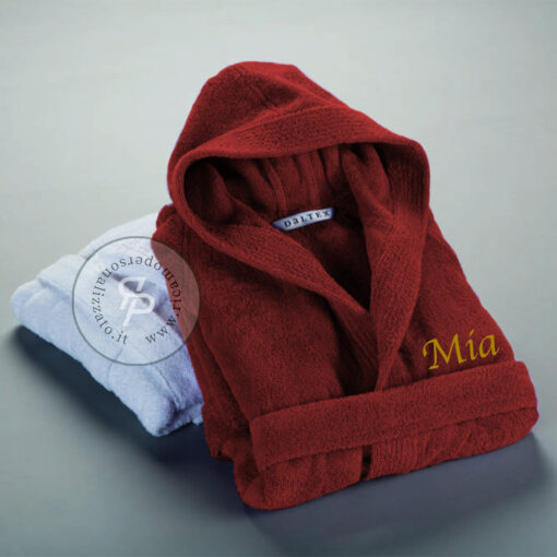E’ possibile personalizzare ogni accappatoio con nome ricamato, L’utilizzo di filati di alta qualità durante il processo di personalizzazione a ricamo, rende la personalizzazione di questi asciugamani resistenti al lavaggio garantendone colori brillanti.