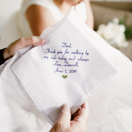 E’ una delle usanze connesse al matrimonio che sta tornando sempre più di gran moda. Quella del fazzoletto ricamato con un messaggio personalizzato è una tradizione che rende la giornata personalizzata ed emozionante. Regalare un fazzoletto personalizzato alla padre della sposa, sarà un momento che tutti ricorderanno con affetto, non solo il giorno del matrimonio, ma per tutta la vita.