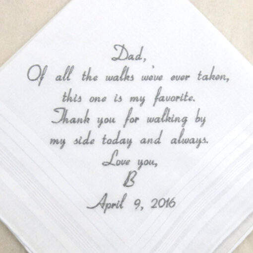Fazzoletto con dedica per il papà della sposa, accessorio per personalizzare il giorno del matrimonio e dedicare delle parole di affetto. Che sia il papà della sposa, o qualche altro caro, questo fazzoletto racchiude tutto l’affetto sincero verso qualcuno. Regalo ideale per far arrivare al cuore dei vostri cari le parole più belle.