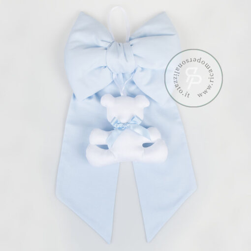 Il nostro fiocco nascita azzurro è realizzato a mano, curato in ogni dettaglio e personalizzabile con nome e dedica.