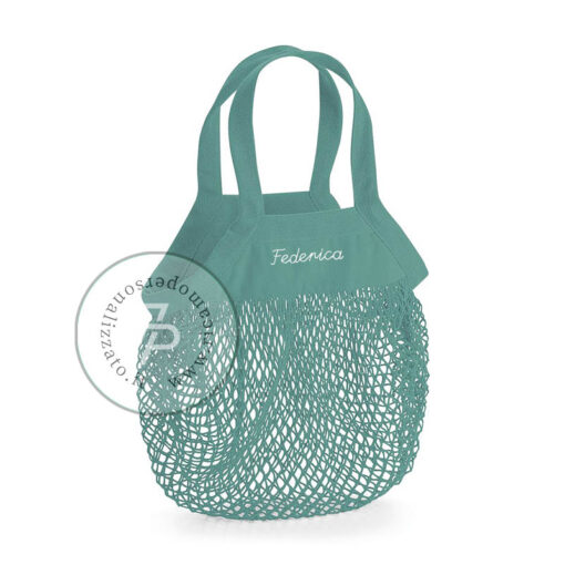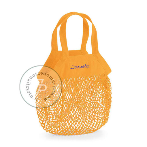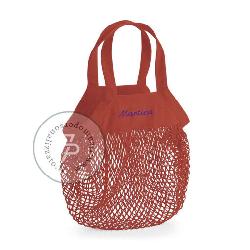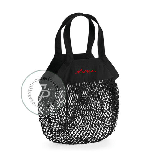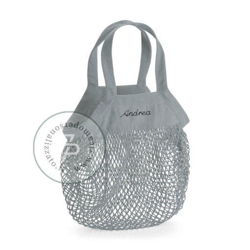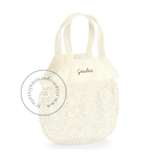 Grocery Bag a rete con nome impresso sul fronte a ricamo completamente personalizzabile.