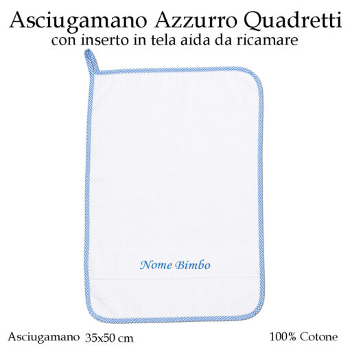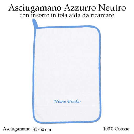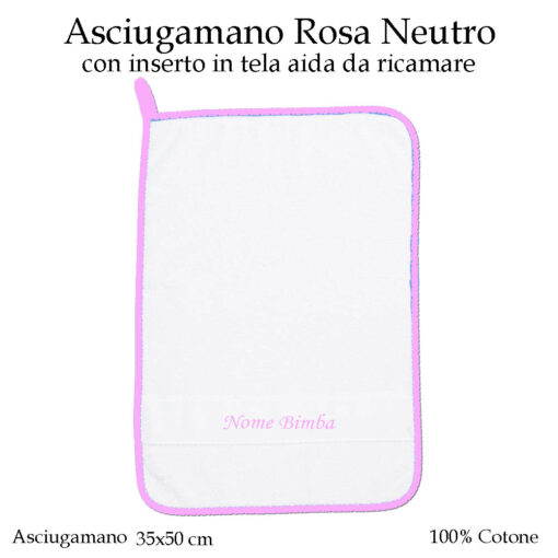 L’asciugamano ha un inserto in tela aida che ne permette la personalizzazione e pertanto l’immediata identificazione.